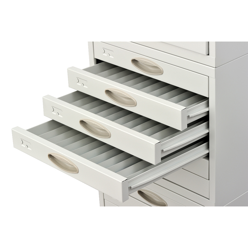 底座采用宝钢SPCC1.2冷轧钢板,箱体0.8冷轧钢板,抽屉0.8冷轧钢板,每组3节,加底座一只,每节六个大抽,中间有活动分隔条可灵活归类,可存放包埋盒蜡块11000块左右。